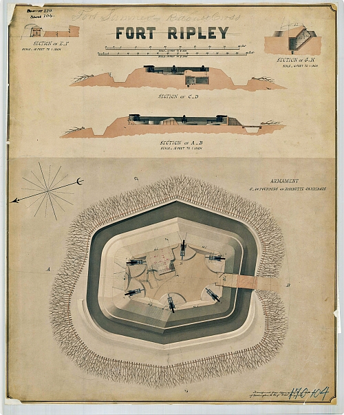 The Civil War Defenses of Washington from the National Archives refers to a series of forts and smaller earthworks that ringed the city of Washington, DC during the Civil War. These were designed to protect the nation’s capital from attacks by Confederate forces. There are for some better-known forts like Fort Stevens, Fort Totten (near the Fort Totten Metro Station), Fort Ward, and Fort DeRussy (in Rock Creek Park), but also for many smaller and lesser-known fortifications scattered throughout the surrounding areas. The plans for the forts range from hand-drawn manuscripts and rough sketches (like the plan for Fort Stevens above) to finished and often quite ornate and beautiful drawings. While many of the plans show the overall layout and design of the forts, others show architectural details for barracks buildings, power magazines, and other specific structures within or around the forts. (570 items)