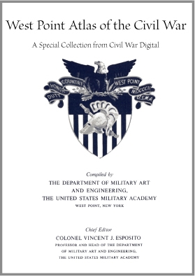 The West Point Atlas of the Civil War. Originally published in 1959 as part of a two-volume set is considered a classic of military history. The original volumes were prepared by distinguished members of the Department of Military Art and Engineering at the U.S. Military Academy and used as instructional tools for the cadets. This mammoth and invaluable work was created under the direction of Brigadier General Vincent J. Esposito, a faculty member at West Point for more than twenty years. His highly respected endeavor allows readers to easily follow the entire course of a campaign or battle in detail while gaining a greater understanding of the Civil War. <<Sample Map>>>